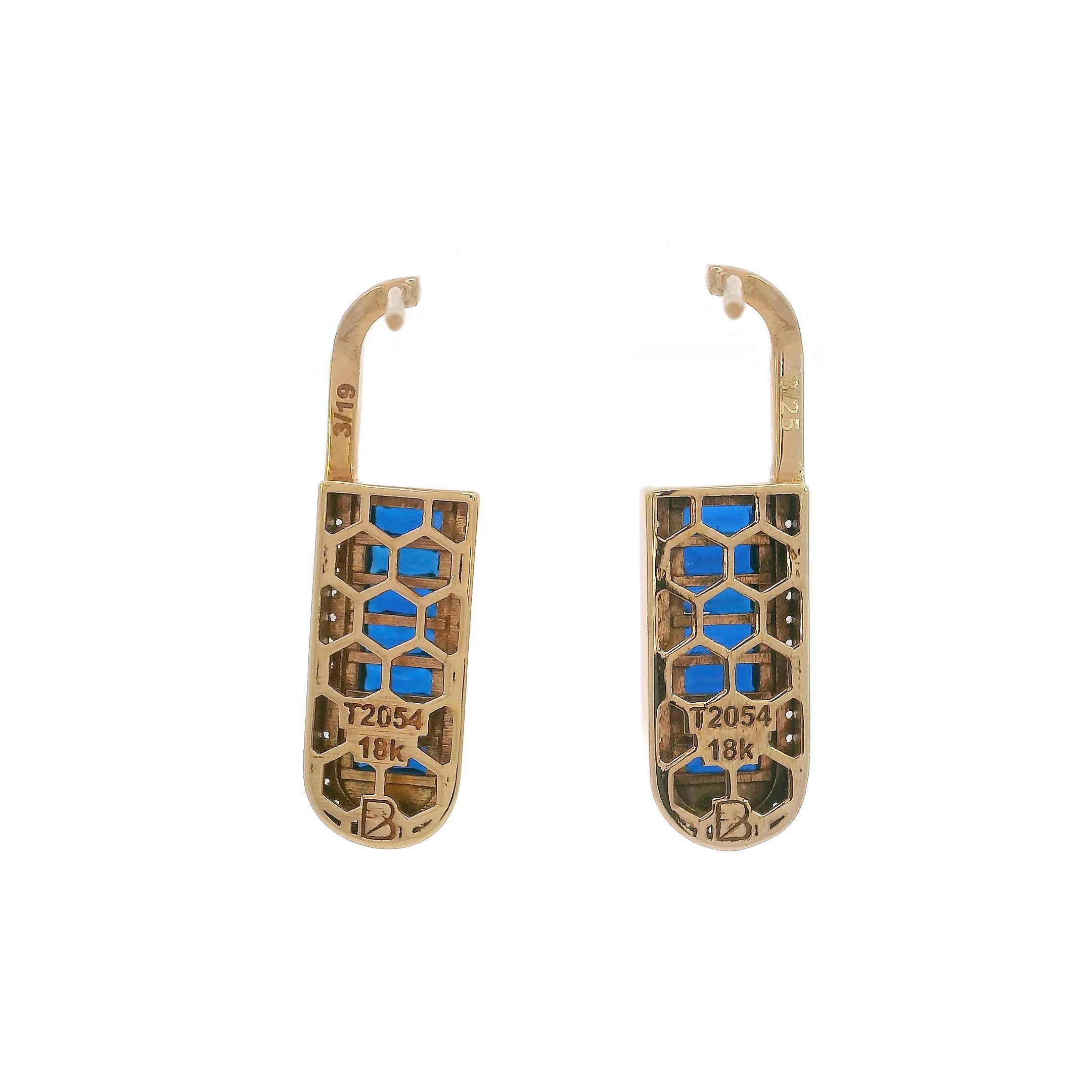 Elegant 18k gold earrings with deep blue accents in a sleek vertical design, crafted to capture light and movement with timeless sophistication.