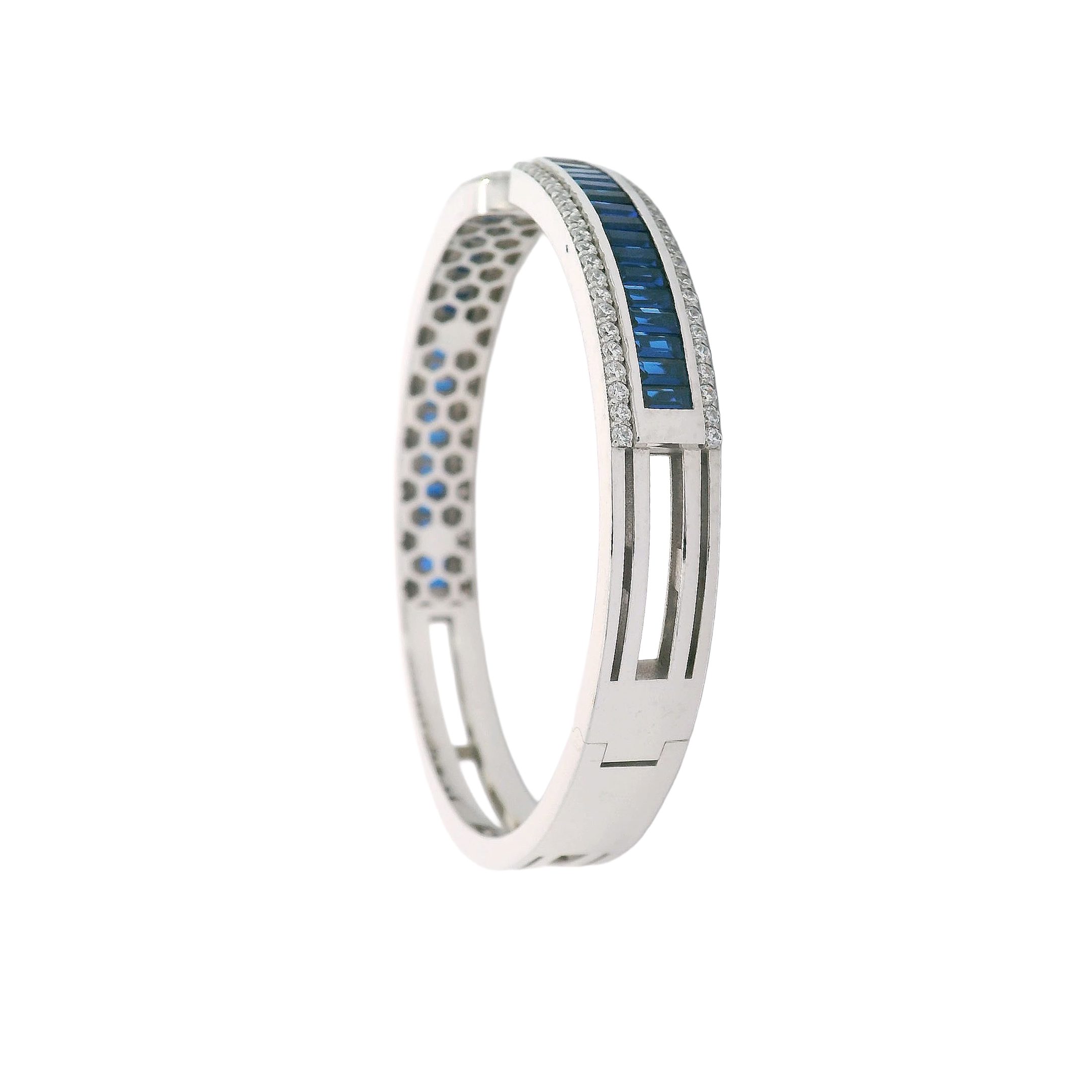 A sleek open bangle in white gold, lined with deep blue accents framed by a shimmering border — echoing the graceful flow of cascading midnight waters.