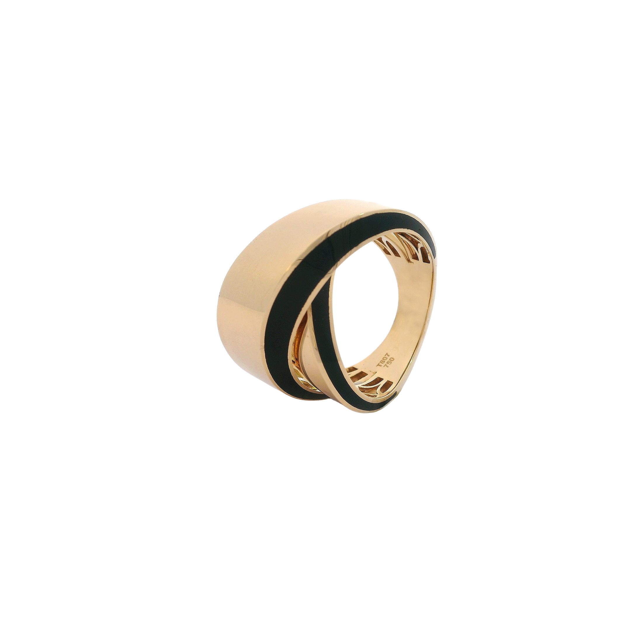 A bold gold ring defined by its sweeping curve of deep black enamel. The contrast of sleek enamel against warm gold creates a statement of strength, elegance, and modern refinement.