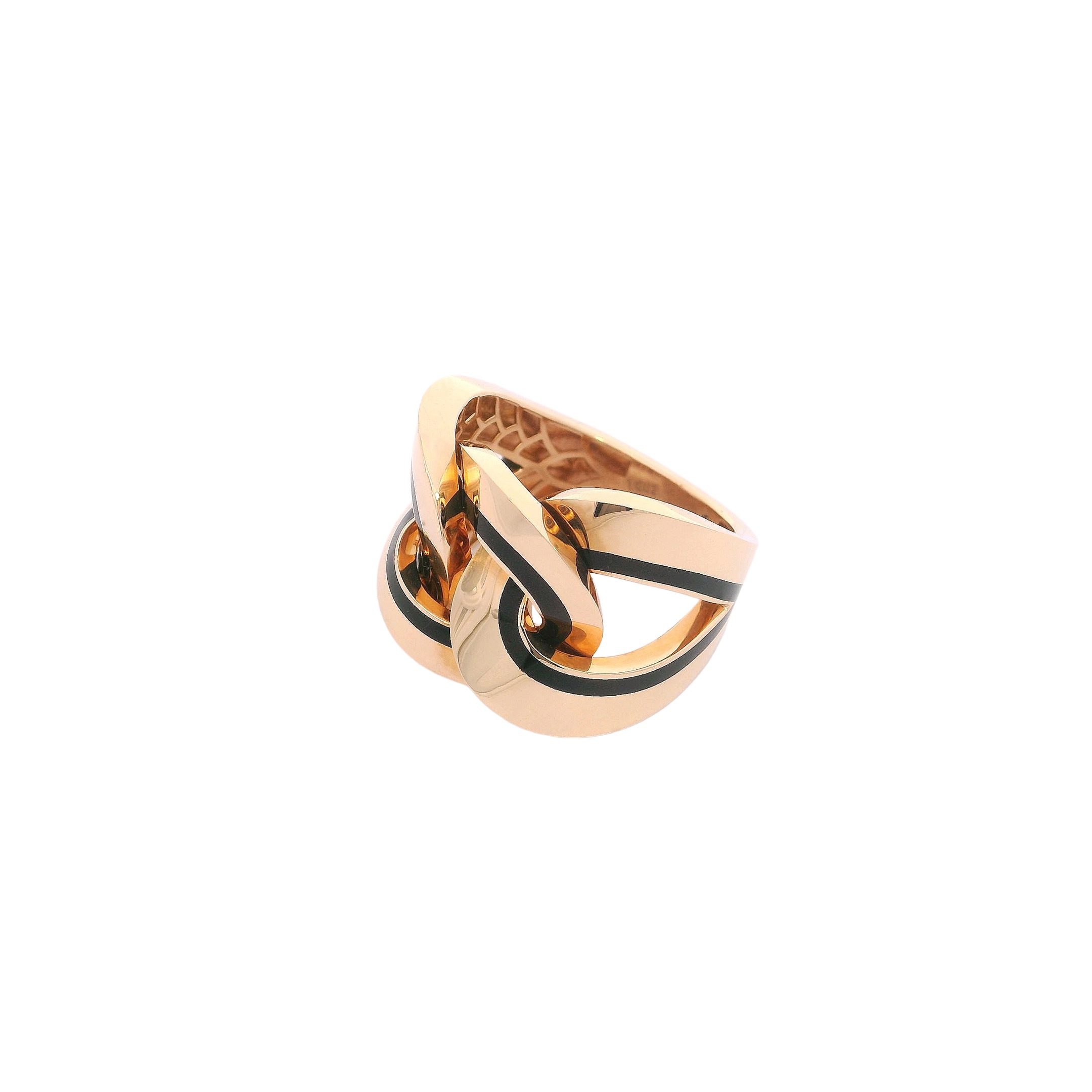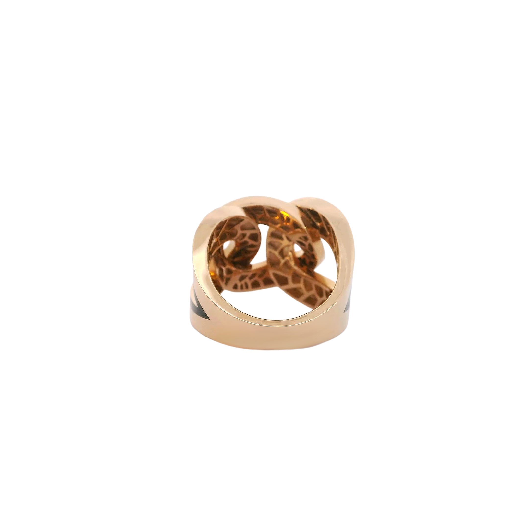 An 18K rose gold ring with sleek black enamel, designed with interlocking links that embody unity, elegance, and enduring strength.