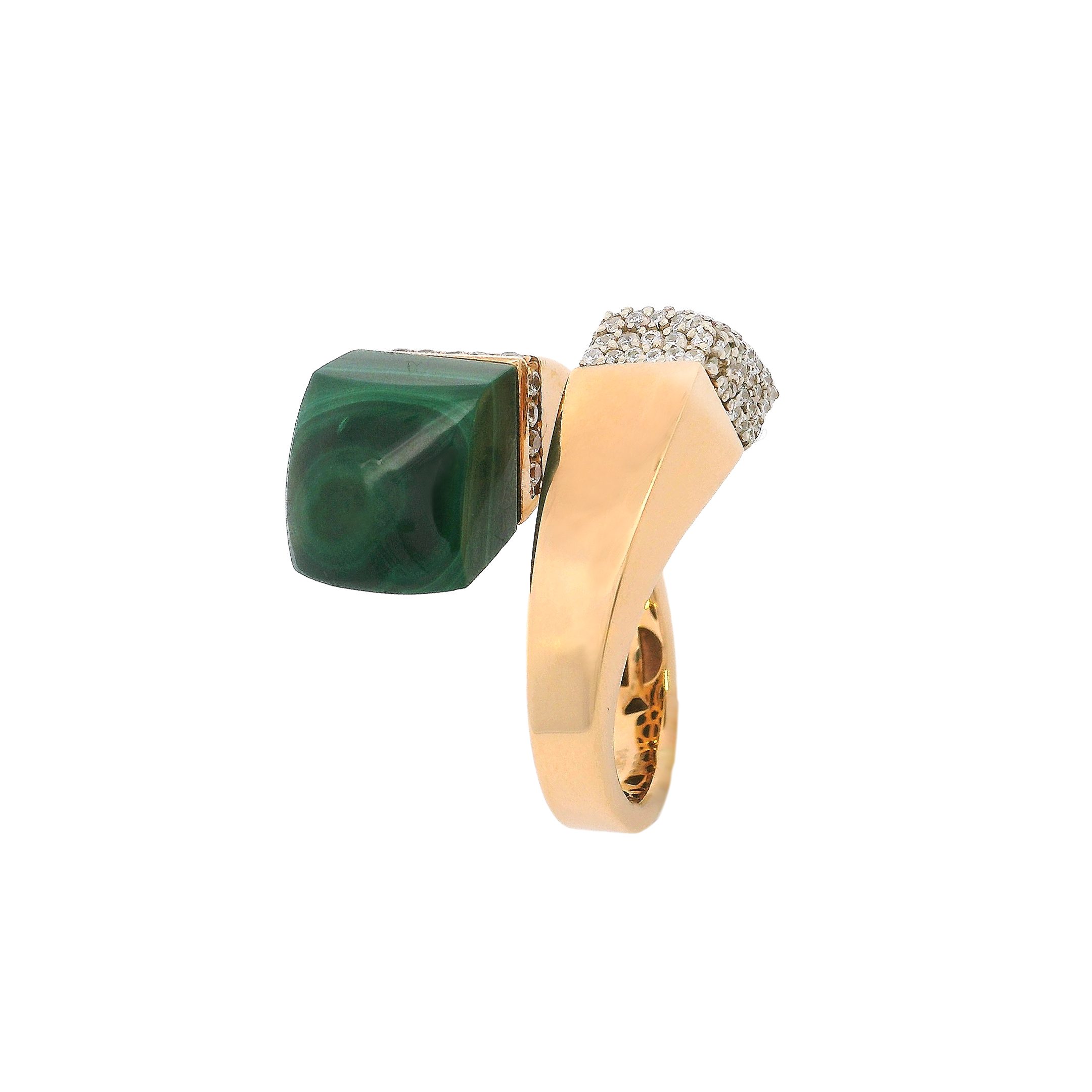 A striking 18k gold ring featuring a bold geometric green accent paired with shimmering textured details, crafted to embody contemporary elegance with an artistic flair.