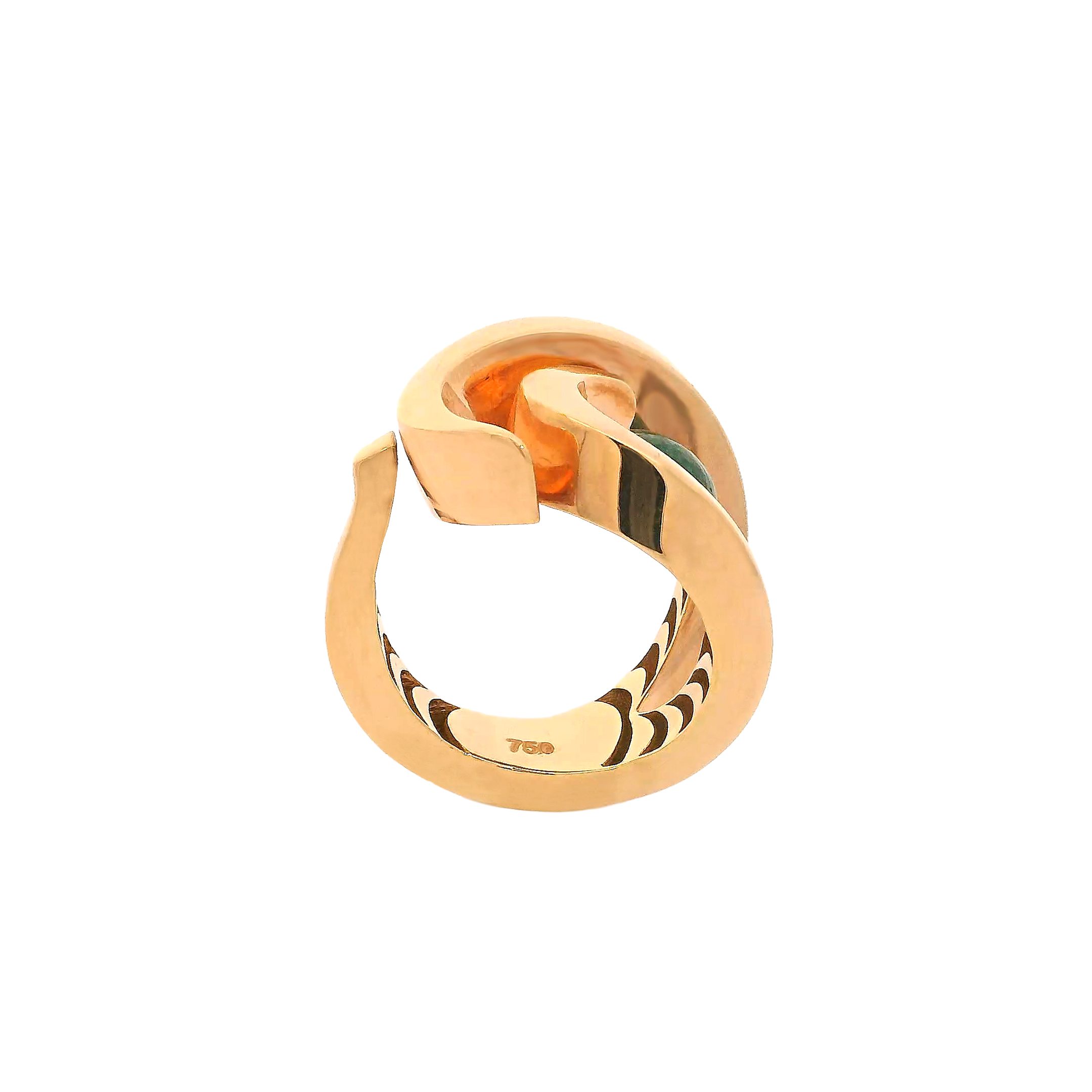 A bold 18k gold ring featuring a smooth malachite centerpiece set within an artistic open design, crafted to showcase modern elegance with a touch of natural beauty.